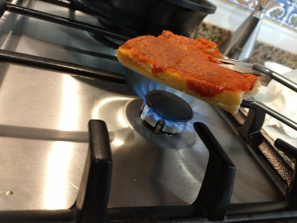 Huntad el pan con la sobresada. En mi caso, como sólo tengo que hacer un par de rebanadas, paso el pan con la sobrasada sobre la llama del fuego, por ambos lados, con la ayuda de unas pinzas de cocina. El sabor resultante es excelente.