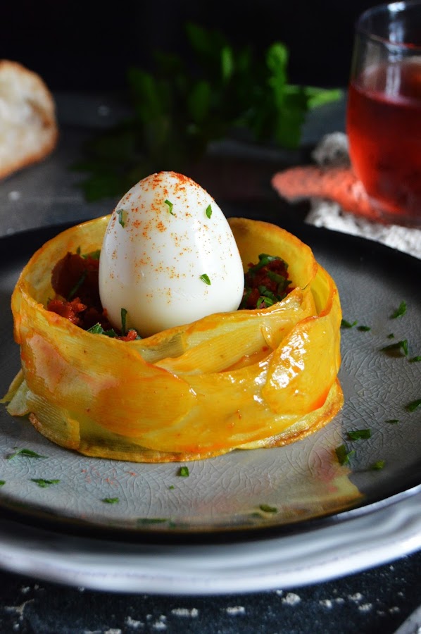 Con mi propuesta quiero recordar los huevos con patatas y chorizo de toda la vida, un plato sencillo con el que de vez en cuando deberíamos darnos el capricho. Para darle un punto diferente el huevo lo hice mollet en vez de frito, delicioso con su yemita chorreante, el chorizo lo desmigué y las patatas en corona y al horno. Una presentación diferente y los sabores de siempre.