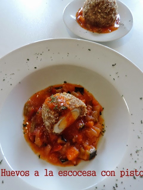 Ahora solo nos queda buscar una salsa para acompañar los huevos escoceses,es una de las pocas exigencias que nos ha marcado Mabel.Así que mejor que un buen pisto,sano y nutritivo,uno de los mejores pistos que he probado.Por que hay ocasiones que poniendo los mismos ingredientes nos sale más sabroso que nunca o al revés,claro...pero esta vez la suerte estaba de nuestra parte.