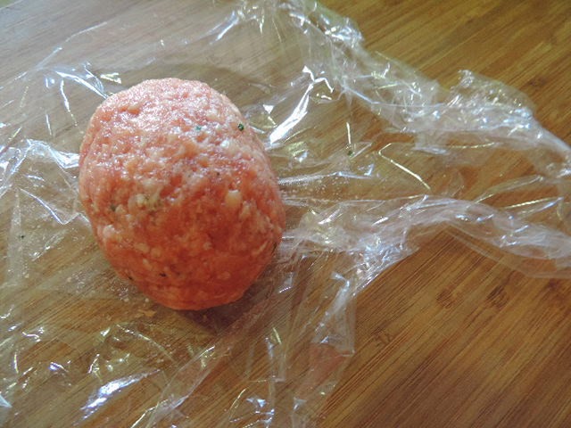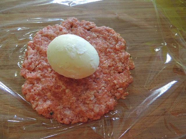 Ponemos el huevo en el centro y lo envolvemos con la carne hasta que de todo bien cubierto.