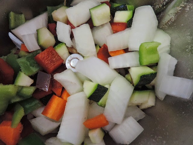 Ahora vamos con la preparación del pisto.Cortaremos toda la verdura en taquitos.Yo siempre suelo triturar la verdura en la thermomix,pero como la ocasión lo merece y queda más lucidor he tirado de cuchillo y tabla.