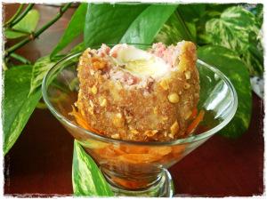 Salpimentamos la carne y envolvemos con ella cada huevo. Pasamos por huevo y luego por pan rallado que habremos mezclado con los cacahuetes en trozos y los freimos durante unos minutos.