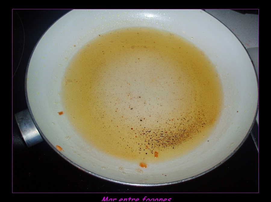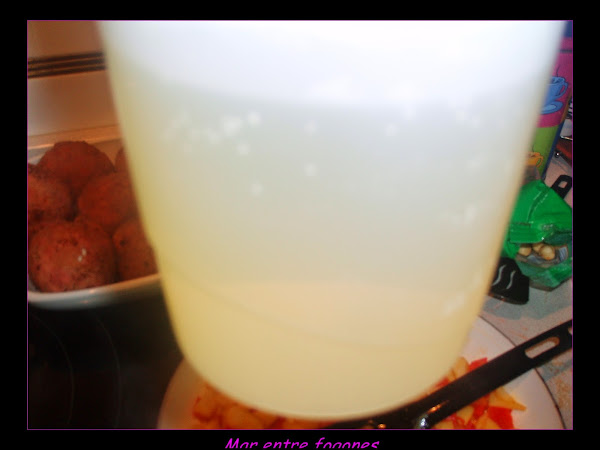 Sacamos la mitad del caldo a un recipiente y lo reservamos.