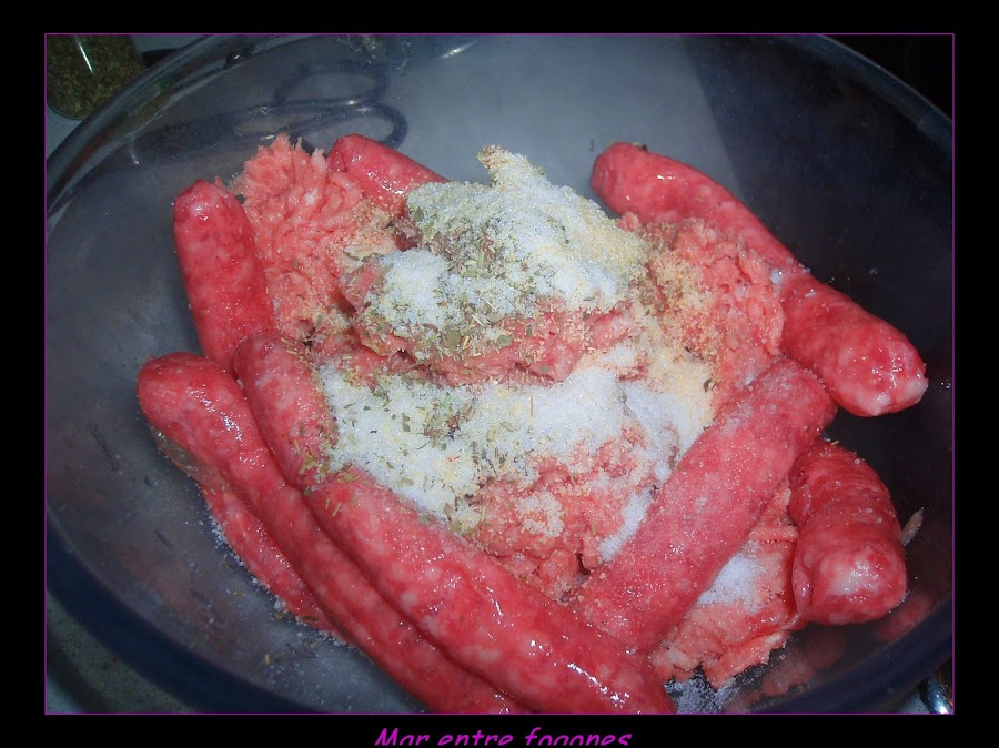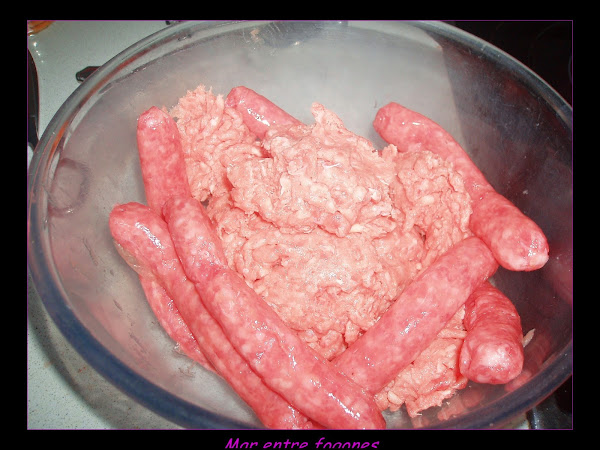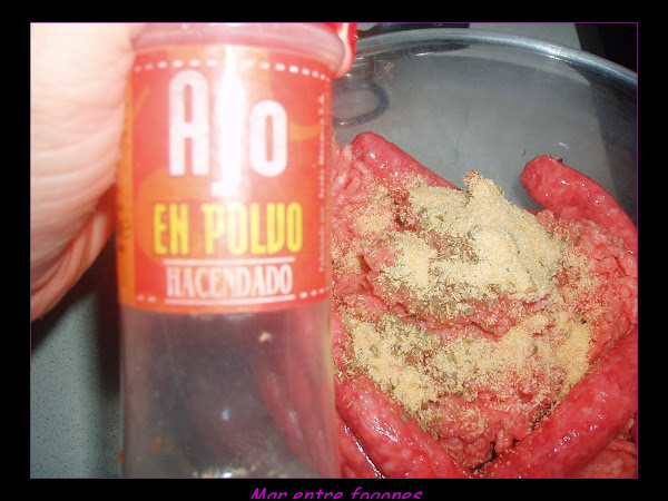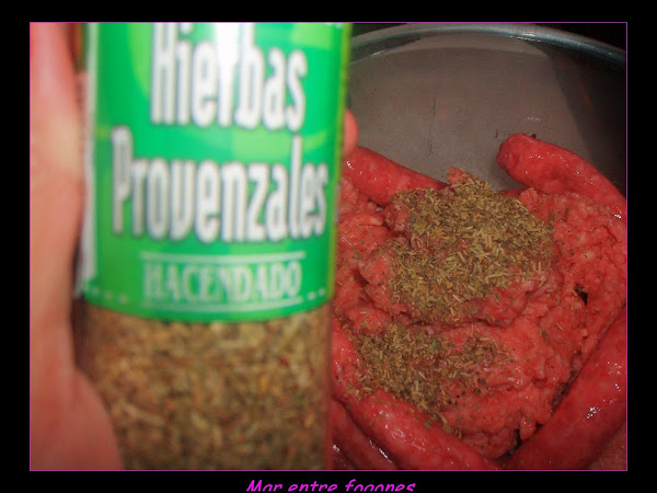 En una fuente ponemos la carne picada, la carne de las salchichas, el ajo molido, las provenzales y la sal.