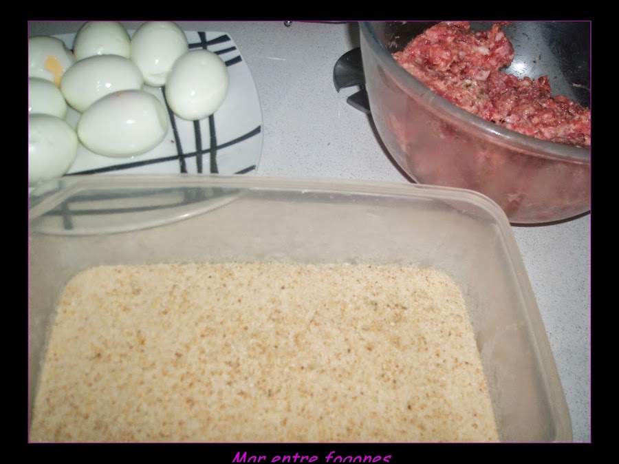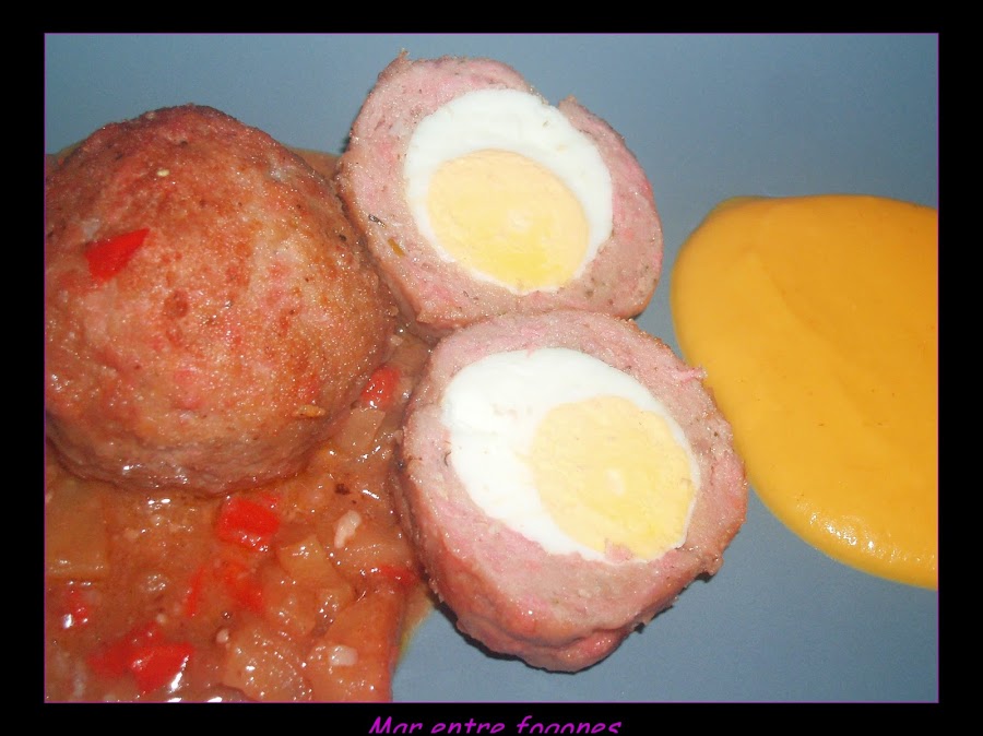 Como puede ser que alguien ya los tenga publicados en el blog, os voy a dar manga ancha y voy a dejar que los hagáis en cualquiera de sus versiones, podéis hacerlos con huevos de gallina, de codorniz... o de avestruz... eso ya como lo veáis, jeje. También podéis recubrirlo con algo diferente a la carne picada o a la salchicha, he visto versiones con surimi que seguro están también deliciosos.