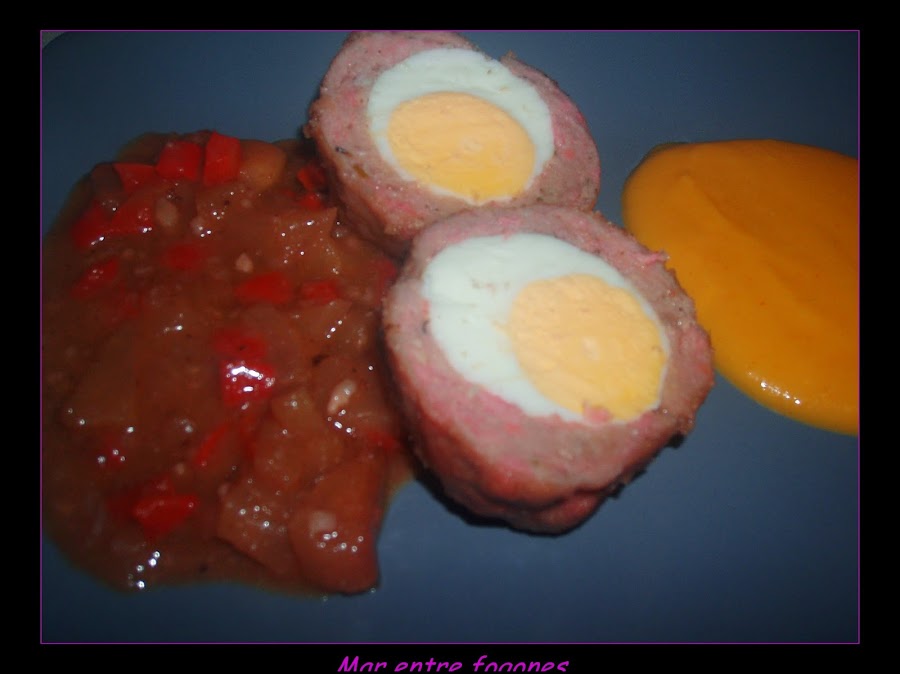 Los huevos a la escocesa se suelen servir fríos, generalmente acompañados de ensalada, aunque también pueden consumirse calientes con alguna salsa. Eso os lo dejo a vuestro criterio, fríos o calientes, para llevar de picnic o como entrante en una cena, pero debéis hacer una salsa... la que queráis, no vale comprada, que la receta ya es demasiado sencilla.