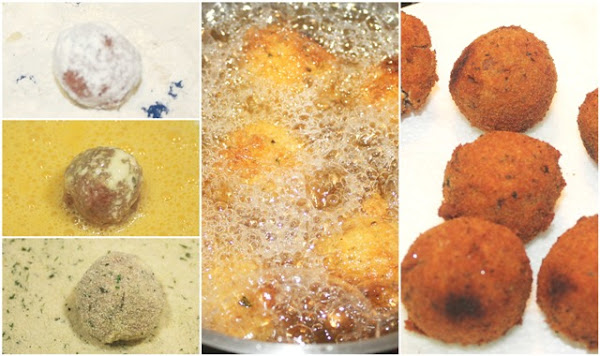 Rebozaremos cada una de las bolas en harina, huevo batido y pan rallado (por este orden) y freiremos en abundante aceite muy caliente.