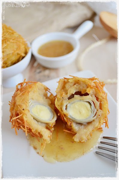 Montamos los huevos, en mi caso con ayuda de una huevera de plástico ( de ahí la forma redonda perfecta) poniendo una cucharadita de masa de croquetas, metiendo con cuidado dentro el huevo cocido, y poniendo más masa por encima para terminar de cubrirlo por completo. Dejé reposar en la nevera de un día para otro para que enfriara y cogiera consistencia.