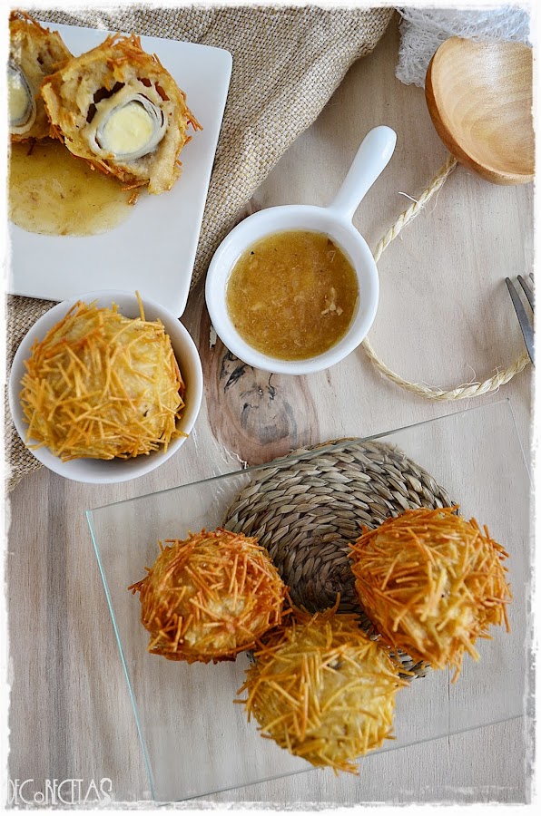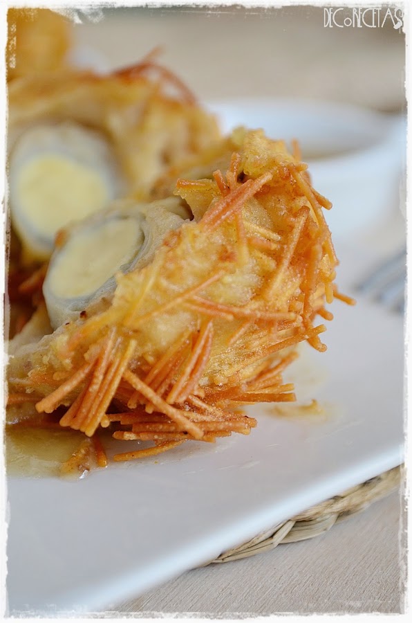 Normalmente se envuelven con carne pero hay muchísima variedad de opciones, y yo en esto no quise complicarme y elegí un relleno de unas simples croquetas de pollo. Creo que el toque del rebozado con los fideos es lo que más tenía que llamar la atención.