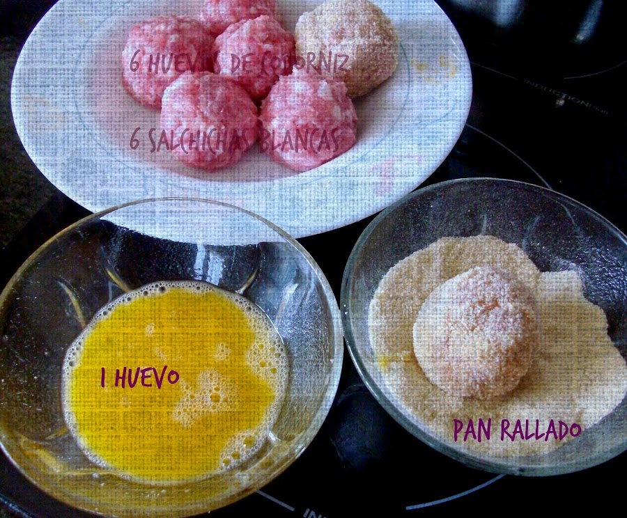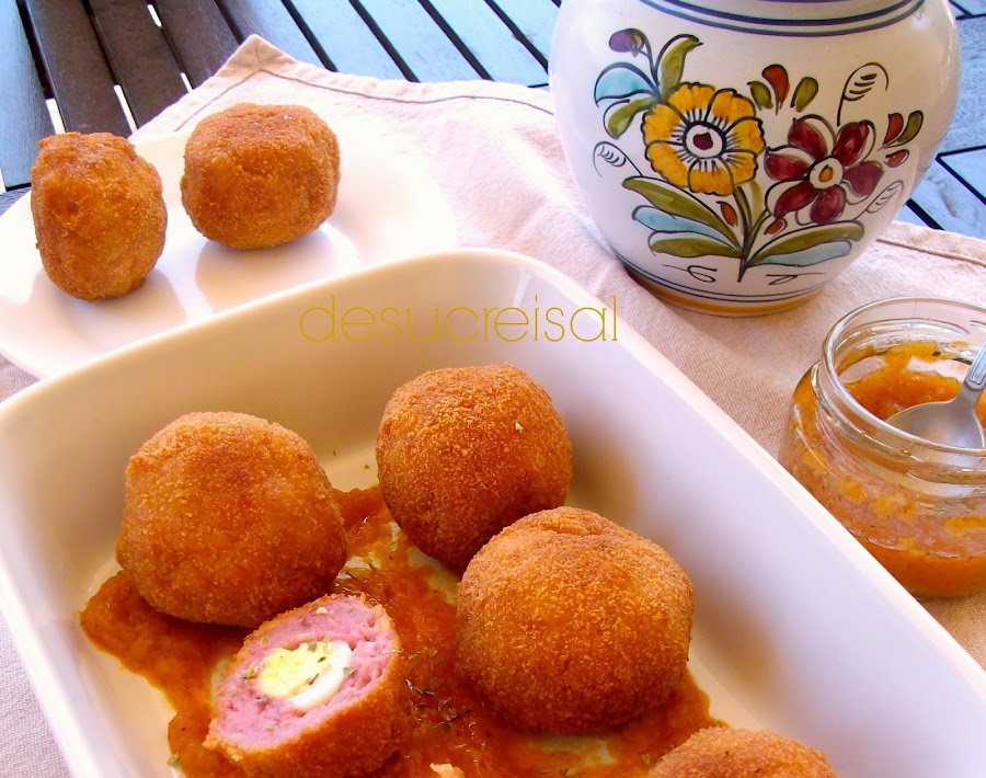 Nuestra desafiadora MARIBEL PEÑAS ,, a sugerido una receta curiosa y que yo no conocia para nada,huevos Escoceses,se trata de un huevo duro sin cascara,envuelto en carne de salchicha ,rebozados en pan rallado y fritos,se suelen servir frios y con alguna salsa.