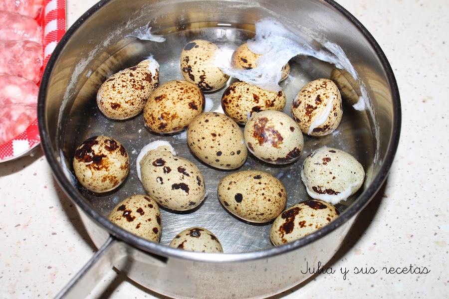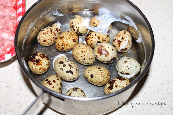 Cocemos los huevos de codorniz con agua unos 5 minutos.