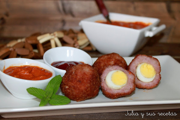 Los huevos a la escocesa es un plato que generalmente se sirve frío, es un huevo cocido al que se le ha quitado la piel y se ha recubierto con carne de salchichas picada finamente, rebozado en pan rallado y frito.