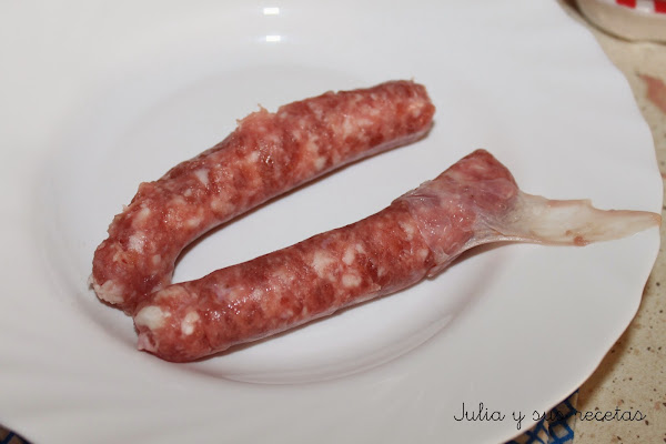 Quitamos la piel a las salchichas las picamos con una tijera y reservamos.