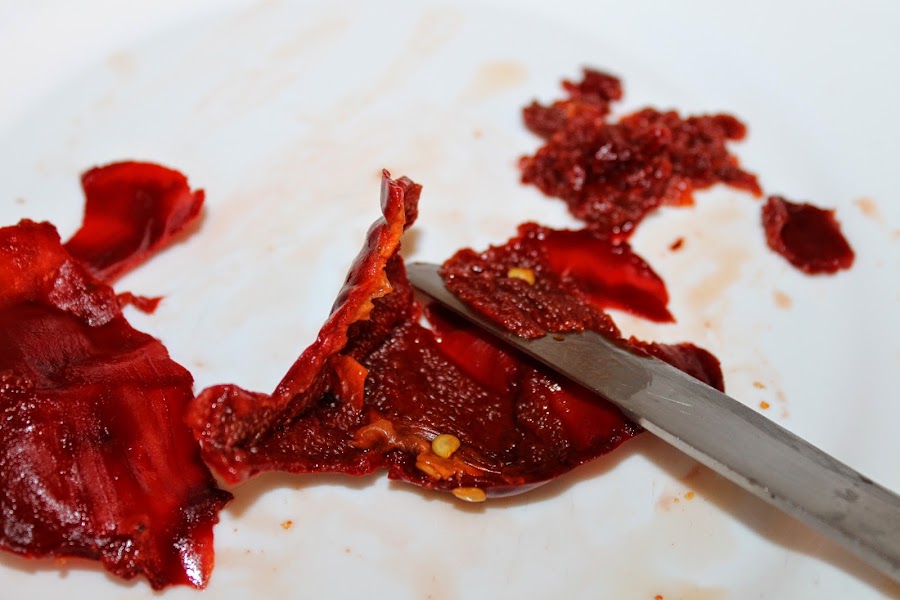 Hacemos la salsa Romesco: Ponemos las ñoras en remojo en agua tibia unos minutos, hasta que se le ablande la carne. La retiramos con un cuchillo.