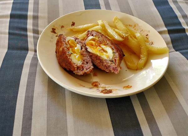 Tenemos que formar una especie de albóndigas de carne con el huevo dentro. Para ello utilizamos papel film, colocamos una cantidad suficiente de la masa de carne y la aplastamos, colocamos encima el huevo pelado y pasado por harina y lo rodeamos de carne.