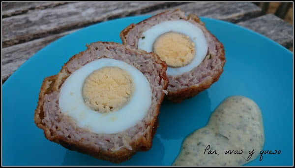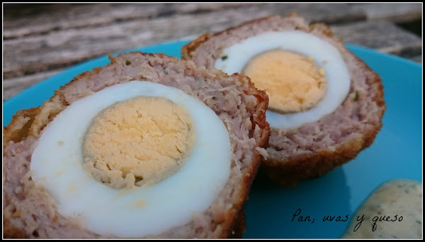 Una vez que los huevos están fríos, los pelamos. Dividimos la carne de las salchichas en 6 partes iguales. Hacemos una bolacon cada porción de carne y la aplastamos como si fuésemos a hacer una hamburguesa. Colocamos en medio un huevo y envolvemosel huevo con la carne. Repetimos con todos los huevos.