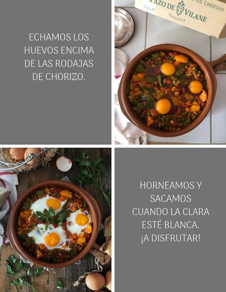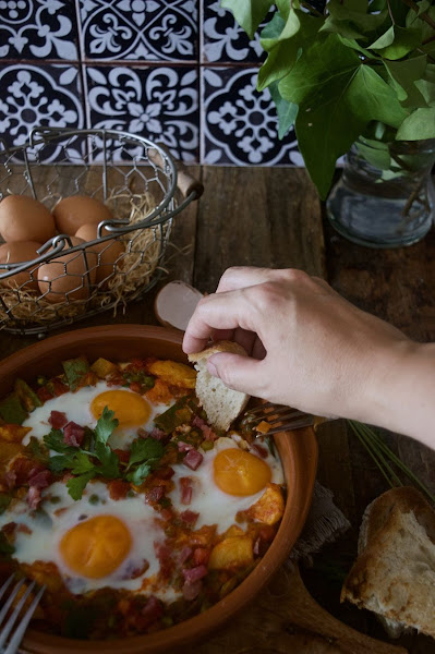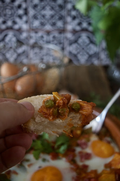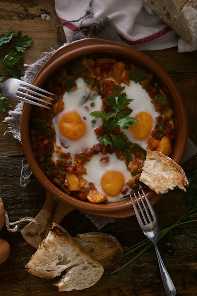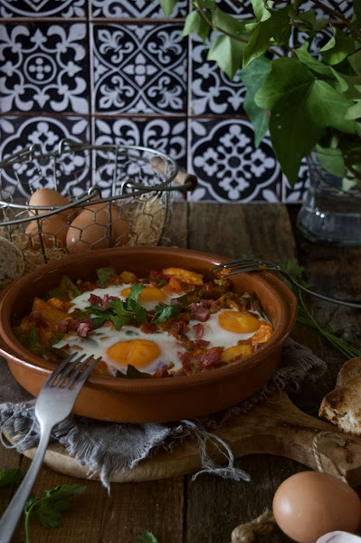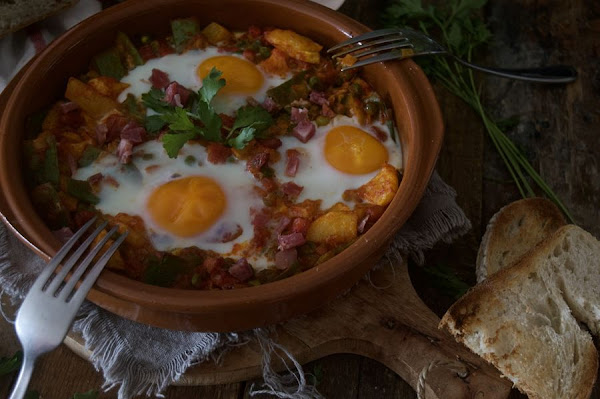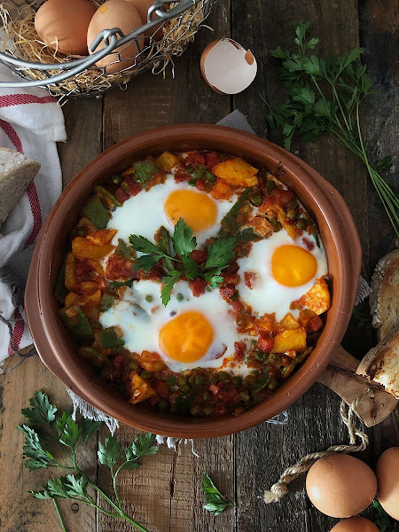 Spanish Flamenco Eggs or "Huevos a la flamenca" how it is called in its place of origin, are eggs cooked in a clay pot, with full vegetables and tomato sauce. They are typical in Seville, Spanish southern city, and its part of its traditional cooking: tapas.