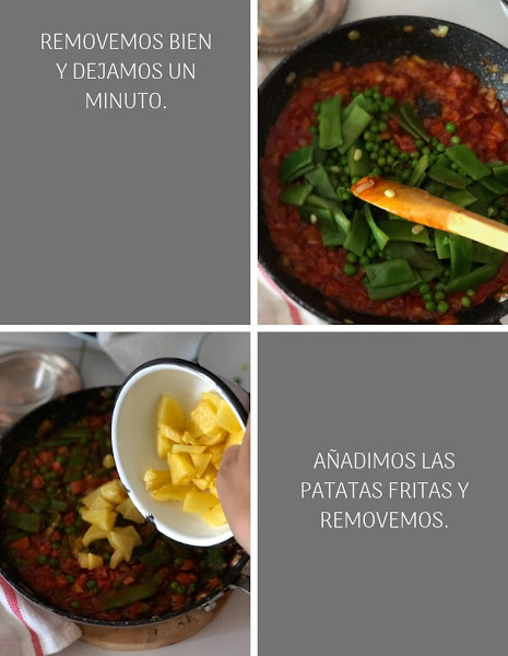 Para preparar este plato, hay que llevar a cabo una serie de preparaciones en primer lugar. Tenemos que cocer los guisantes y las judías verdes. Hay que freír las patatas. Hay que hacer la salsa de tomate si la vamos a hacer casera. Yo, en esta ocasión, he tirado de un bote que tenía abierto de tomate frito, para aligerar. Una vez hecho todo esto, podemos empezar a preparar el plato.