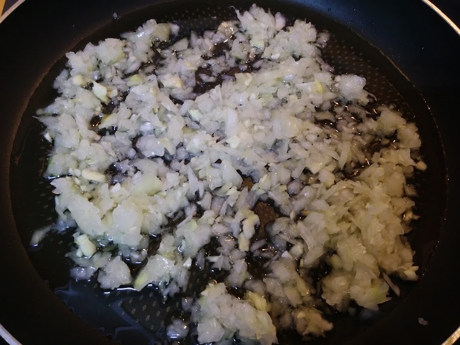 Ahora vamos a rehogar los ajos y la cebolla bien picaditos. Salpimentamos.