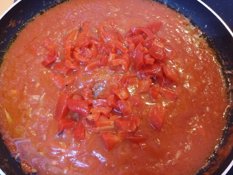 Lo dejamos freír unos 10 minutos y añadimos los pimientos morrones cortados en trocitos.