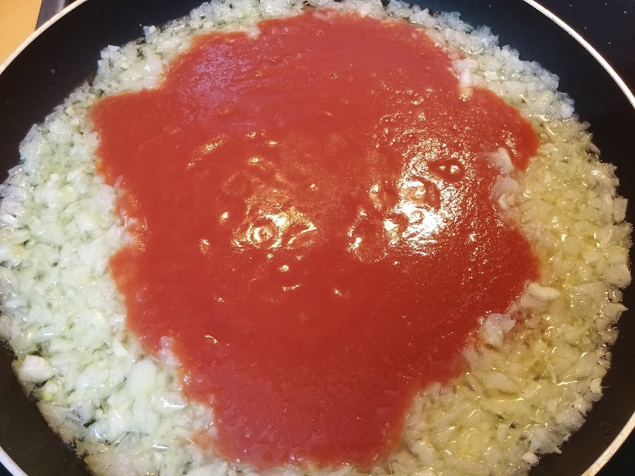 Cuando veamos que empieza a pocharse, añadimos el tomate triturado.