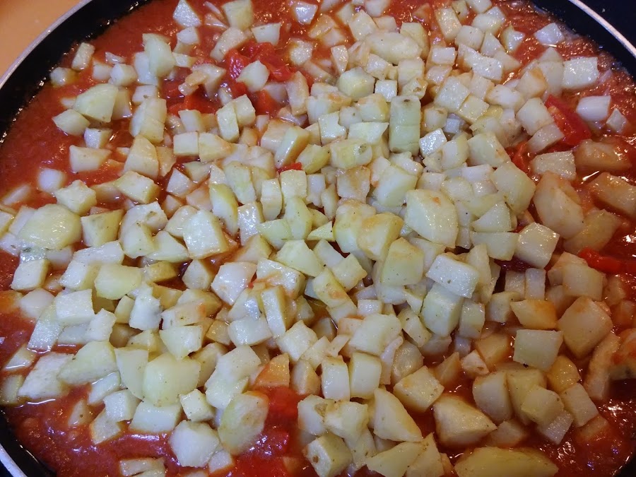 Seguidamente las patatas fritas. Dejamos unos 5 minutos y rectificamos de sal si fuera necesario.