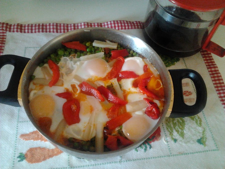 Escurrimos los guisantes cocidos y los añadimos a la cazuela; revolvemos un poco. Bajamos el fuego a la mitad y le vamos echando los huevos al rededor de la cazuela.