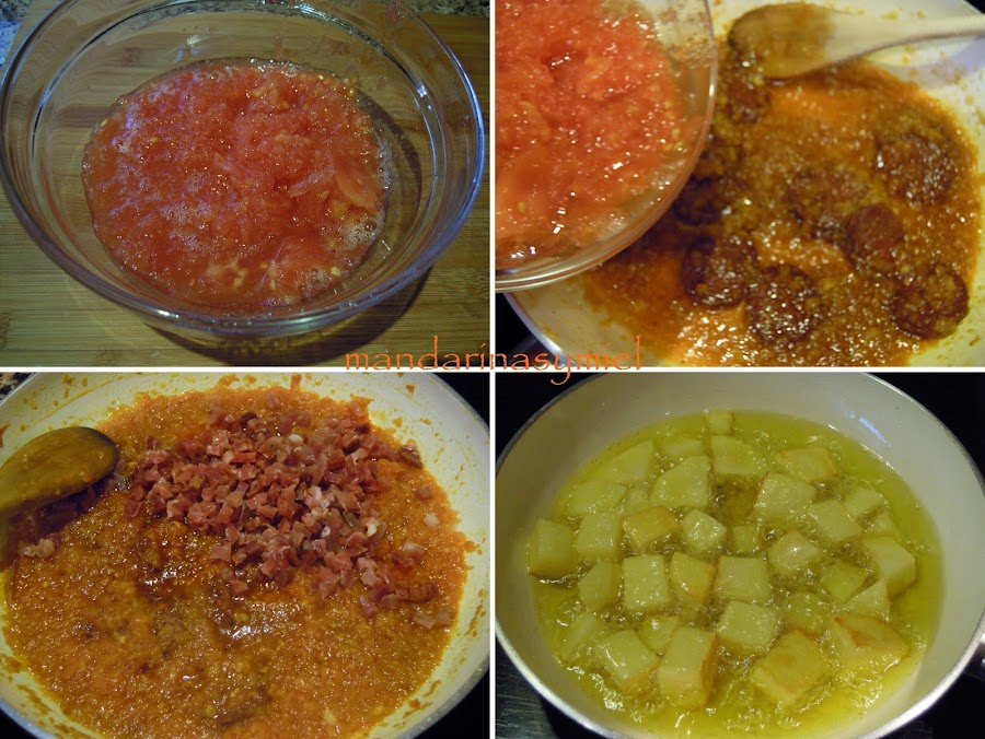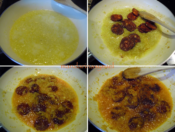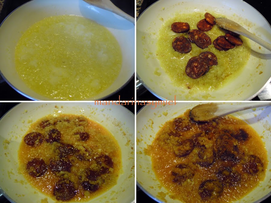 Cuando esté tierna añade el chorizo y dale unas vueltas.