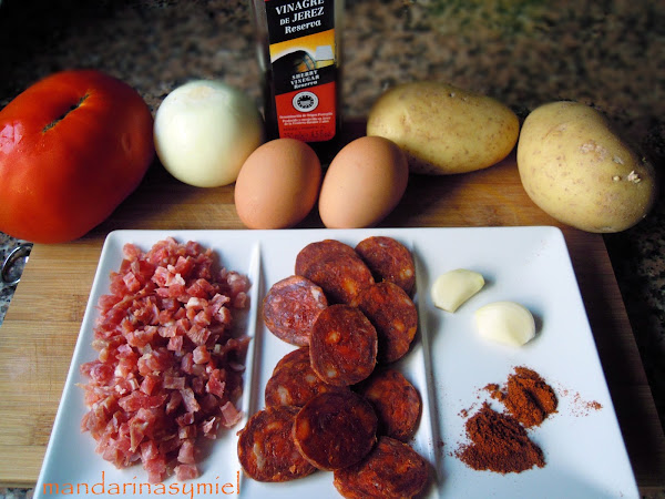 Coloca por encima la mezcla de tomate, chorizo y jamón.