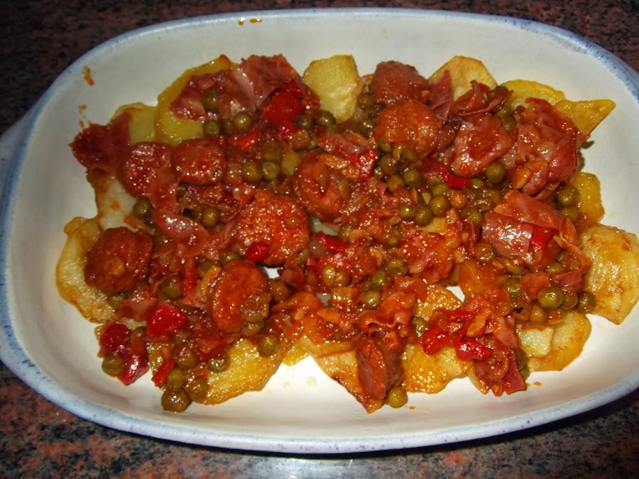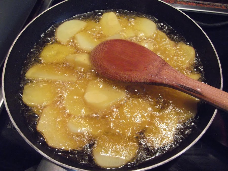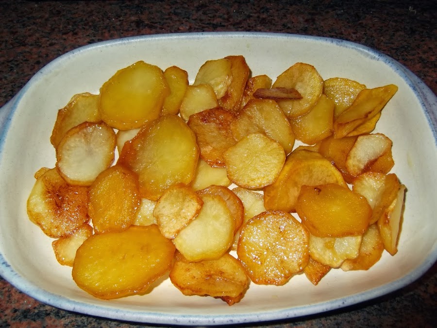 Mientras se van realizando todos estos procesos en otra sartén echamos abundante aceite y las patatas peladas, saladas y cortadas como si fueran para una tortilla de patata. Una vez que tenemos listas las patatas fritas les retiramos el exceso de aceite, colocándolas encima de un papel absorbente.