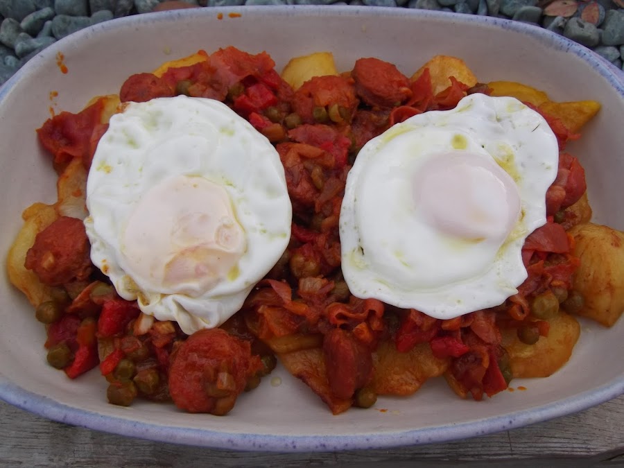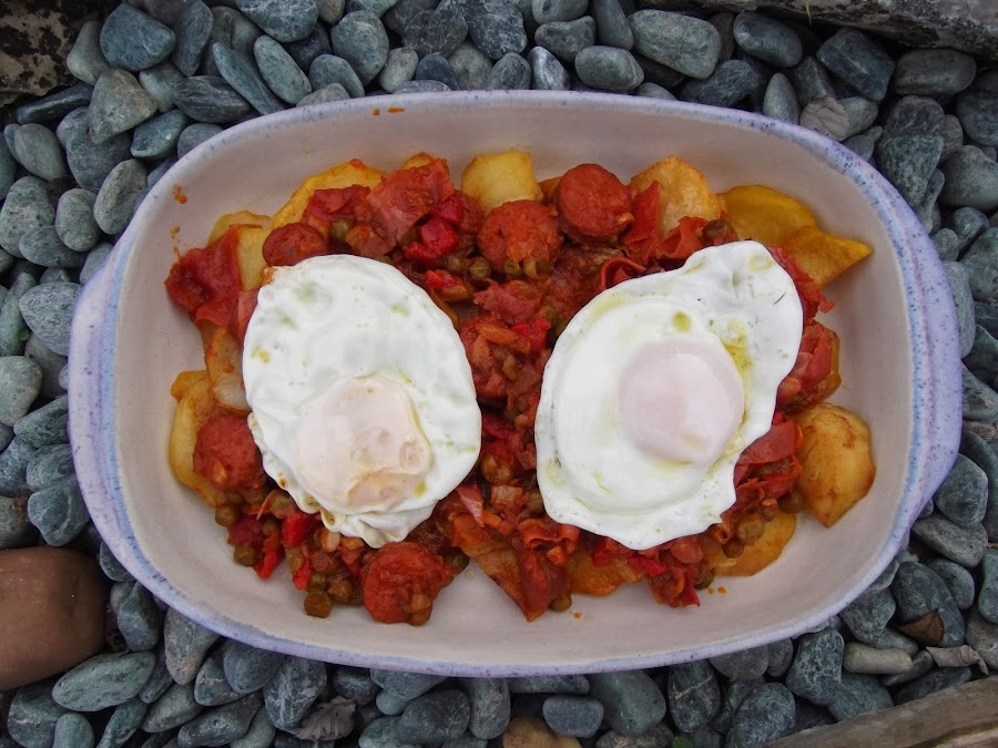 Ahora toca el turno de los huevos, en una sartén con aceite bien caliente se fríen los huevos y se salan. En la receta tradicional, una vez que tenemos montado el plato se meten los huevos al horno y se terminan de cocinar allí, pero a mí personalmente me gustan más fritos. Si los queréis hacer al horno, añadirle un poco más de tomate para que el plato no se os quede muy seco.