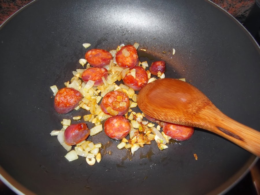 Mientras tanto, pelamos el ajo en trozos muy pequeños y se lo añadimos a la sartén. Lo dejamos todo durante cinco minutos más. Luego cortamos el chorizo en rodajas de un centímetro y se lo añadimos también, cuando haya cogido color, retiramos el sofrito de la sartén y le añadimos el pimentón dulce y le damos un par de vueltas (también se puede sustituir por picante). El siguiente ingrediente que añadimos es el vinagre y tras un par de minutos el tomate frito casero.