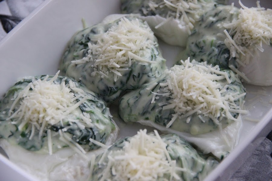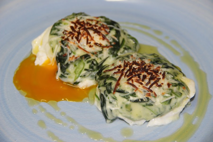 Por otro lado haremos una bechamel de espinacas , en una sartén echamos un chorro de aceite ,reogamos un poco de harina y vamos incorporando la leche , y por último añadimos las espinacas que previamente habremos picado,salamos y cocinamos el conjunto diez minutos y reservamos.Por último pondremos en una fuente de horno los huevos escalfados , napamos con la bechamel y espolvoreamos con queso rallado por encima,con el horno caliente a máxima potencia gratinamos los huevos hasta que el queso este dorado y listo.