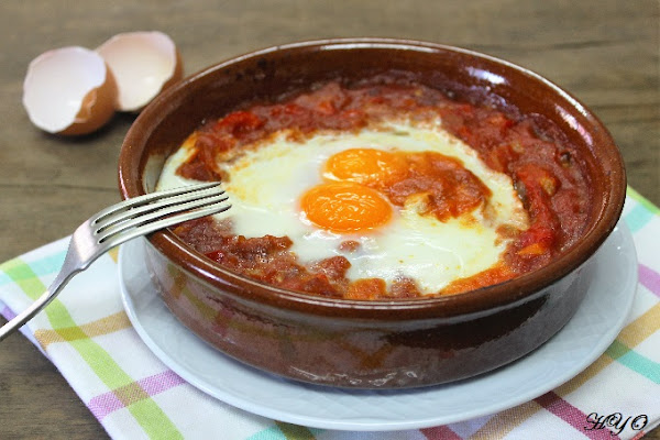 6. Precalentamos el horno a 200º. Cascamos dos huevos en cada cazuelita y horneamos hasta que los huevos se cuajen.