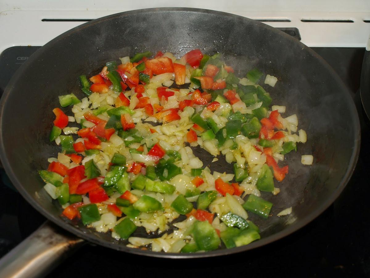- Cuando esté lista, añadimos el pimiento rojo y verde también en trozos. Dejamos que se vaya haciendo.