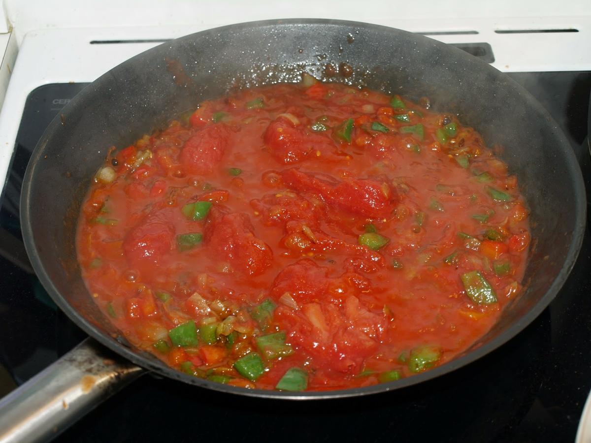 - Cuando el pimiento esté ay bastante hecho añadimos el tomate, el orégano y salpimentamos al gusto. Removemos bien y dejamos que cueza unos minutos, volviendo a remover de vez en cuando para que no se nos pegue.