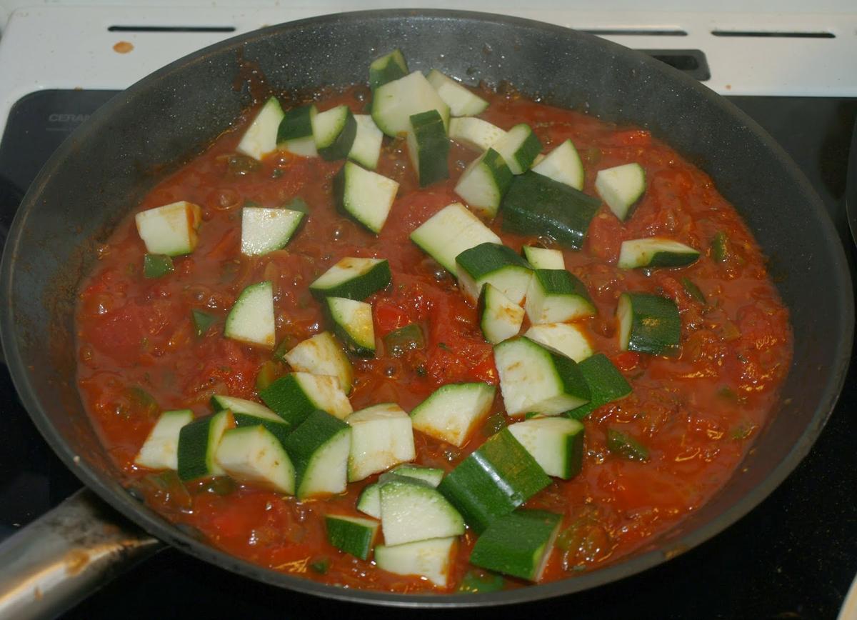 - A continuación añadimos el calabacín troceado, removemos y dejamos que se vaya cocinando. Vigilaremos y volveremos a remover para que no se pegue.
