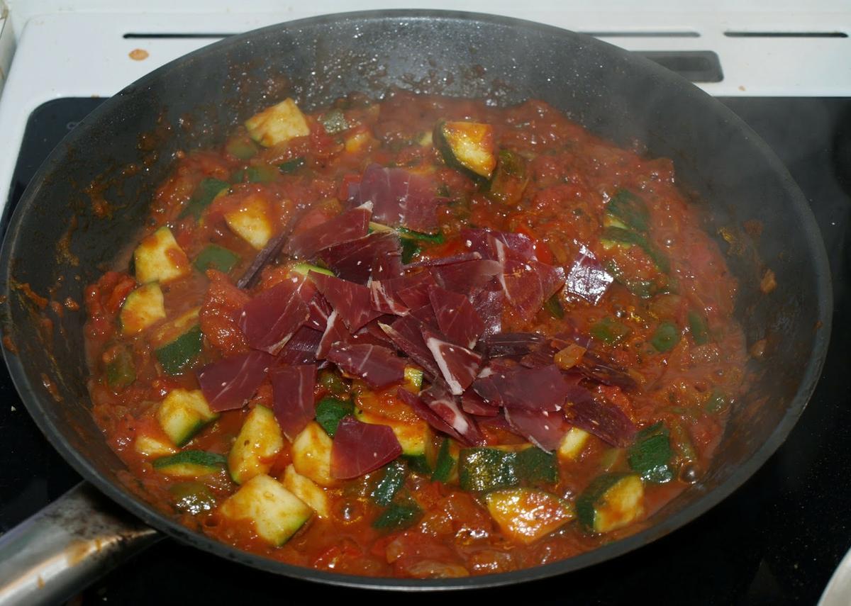 - Cuando veamos que el calabacín empieza a estar tierno (pero no hecho del todo), incorporamos el jamón, removemos bien toda la mezcla, apagamos y retiramos del fuego.