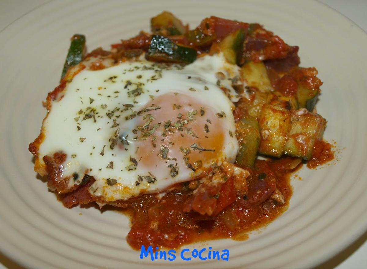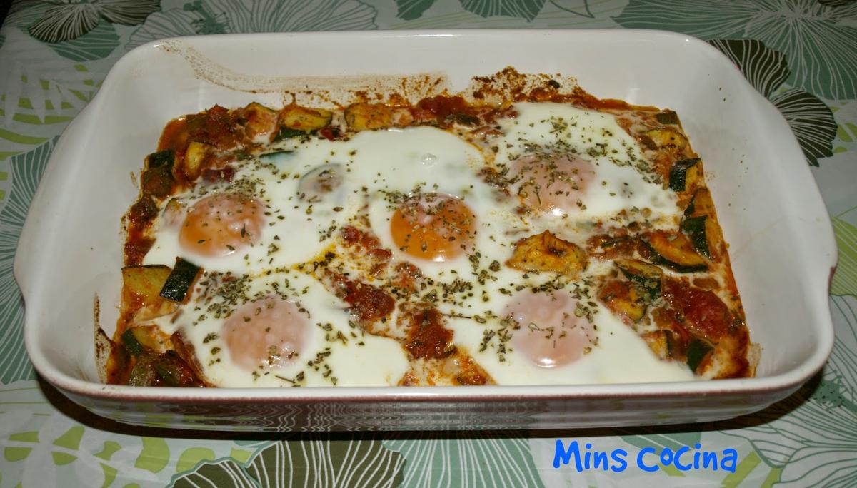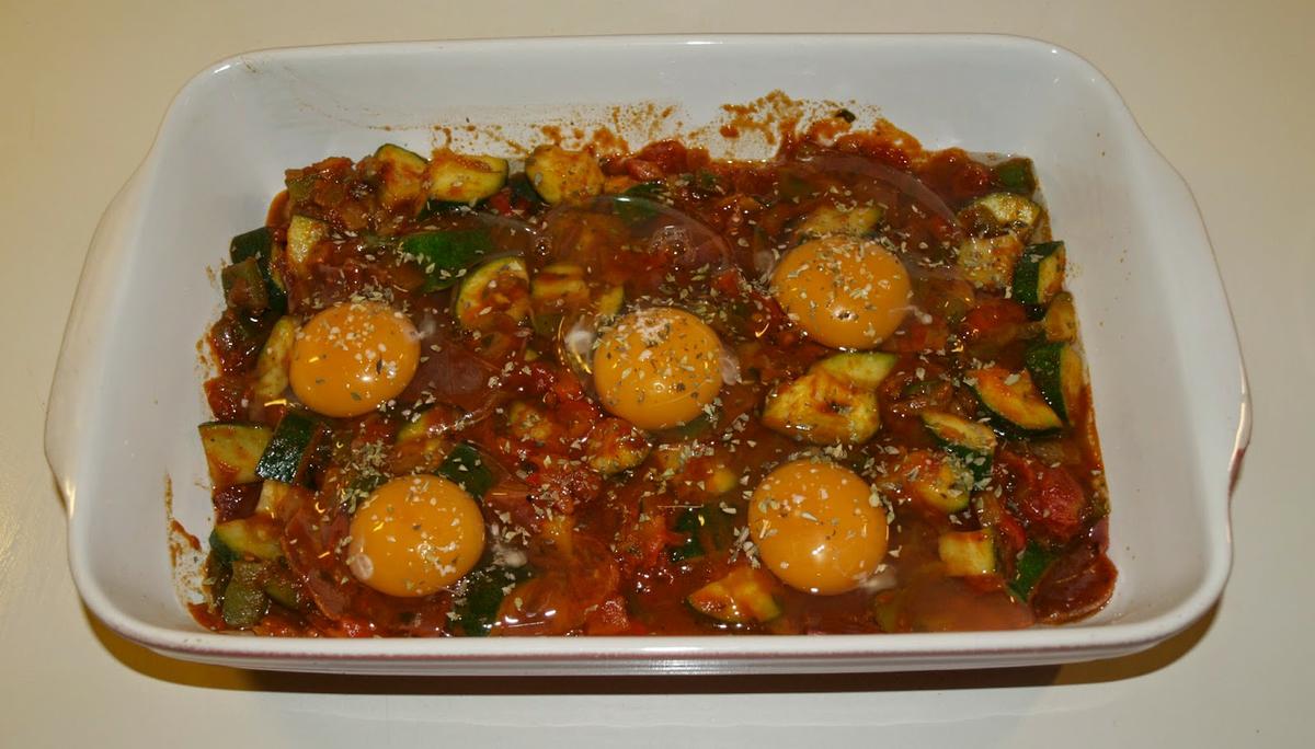 - Lo siguiente que hacemos es poner las verduras en el fondo de una fuente o cazuela, y cascamos los huevos con cuidado encima. Salpimentamos al gusto. Añadimos algo más de orégano, y metemos al horno a 180º C durante unos 15-20 minutos, hasta que los huevos estén cuajados. El tiempo dependerá también de cómo os gusten de cuajados. En general se dice que hasta que las claras estén cuajadas.
