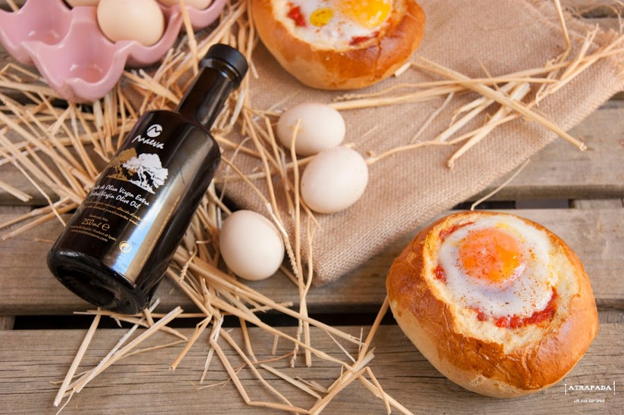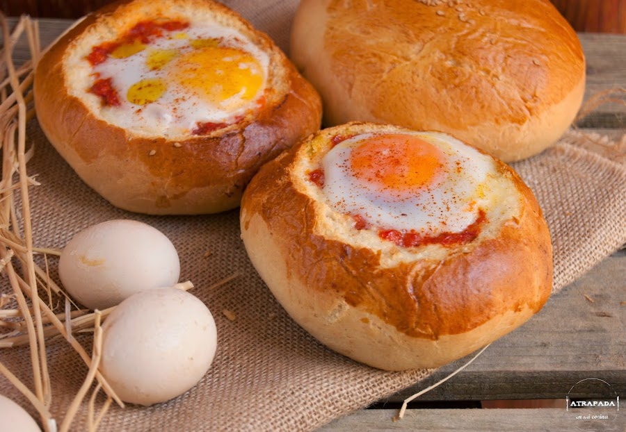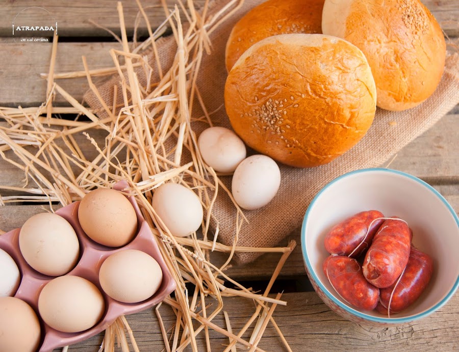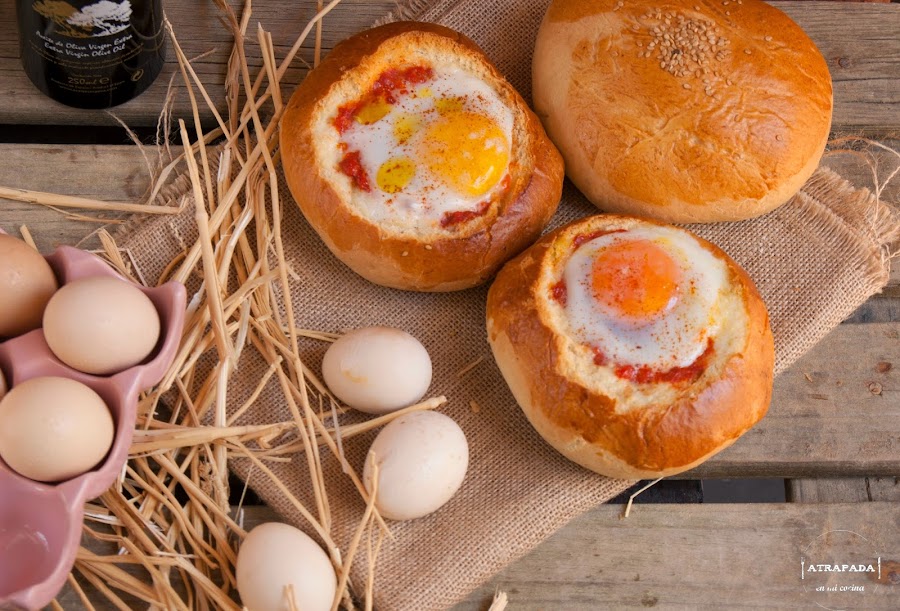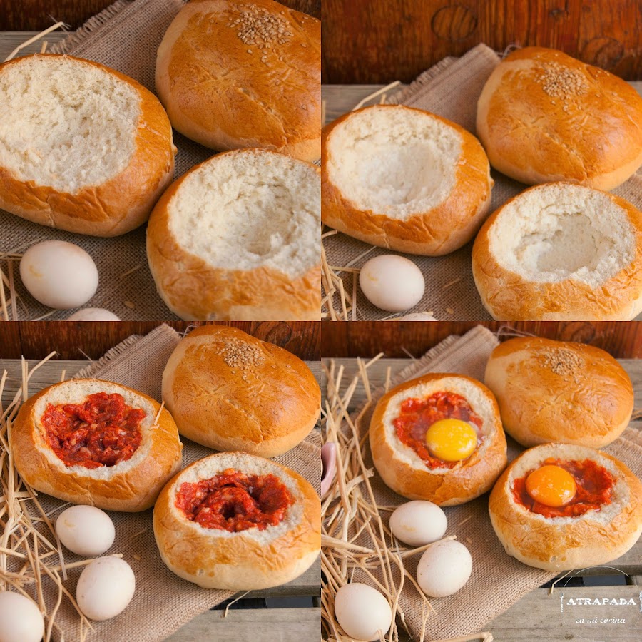 Yo no se a vosotros si os pasa, pero a mi cuando me regalan huevos frescos, lo único que me apetece hacer con ellos es recetas donde éstos sean los protagonistas. Ya son muchas recetas publicadas con los huevos como protagonistas, y cuando me regalaron éstos se me ocurrió preparar unos divertidos huevos al nido que había visto en multitud de blogs. Los panecillos pueden rellenarse casi de lo que sea, pero el huevo tiene que ir coronando el panecillo. Me gustó mucho la versión de Mary, con chorizo, y, a falta de hornear panecillos en pleno verano, compré estos panecillos de hamburguesa en la panadería. No tienen por qué ser panecillos de hamburguesa, pero lo suyo es que sean blanditos, ya que van horneados después.