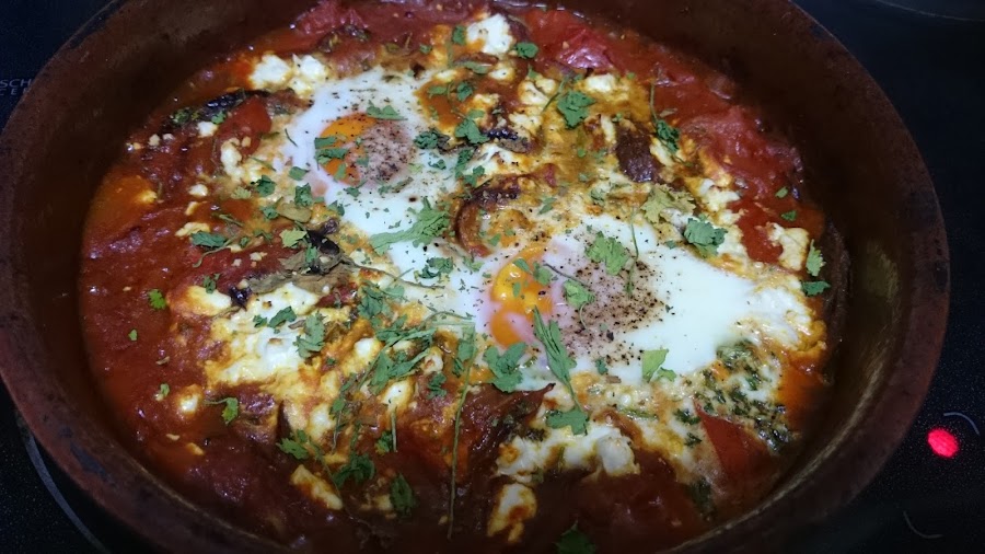 Precalentamos el horno a 180º. Pasamos la salsa a una cazuela de barro o algo apropiado para meter en el horno. (Incluso la bandeja de horno o algo más pequeño). Esparcemos por encima las hojas de cilantro picadas (reservando un puñado para decorar el plato al final) y removemos con suavidad para que se mezclen con la salsa. Cortamos el queso feta en dados de unos 2,5cm y los repartimos sobre la cazuela. Formamos 4 huecos a distancias regulares en la superficie y cascamos los huevos dentro, agregamos una cantidad generosa de pimienta negra y echamos un poco más de sal. Horneamos durante 10 o 12 minutos o hasta que las claras de los huevos estén bien cocidas.
