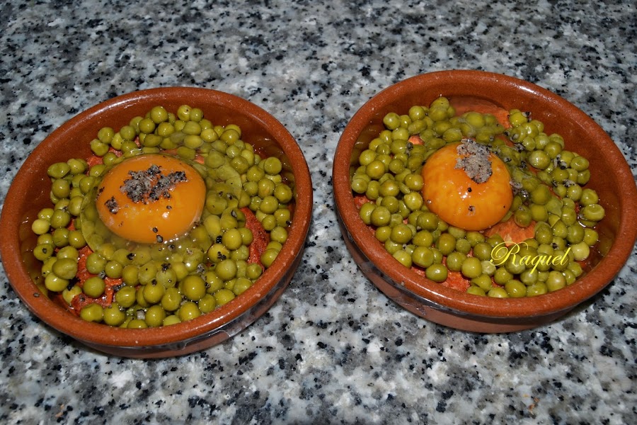 Ponemos en las cazoletas de barro dos cucharadas de tomate, la rodaja de sobrasada, los guisantes y el huevo encima ponemos un poco de sal y rallamos un poco de trufa y metemos las cazoletas al horno.