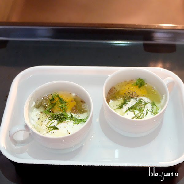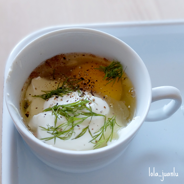 Echamos una buena cucharada de crème fraîche en cada taza. Ponemos un poco de nuez moscada, sal y pimienta. Agregamos un huevo en cada taza, un poco de eneldo picado y añadimos otra cucharada de crème fraîche.