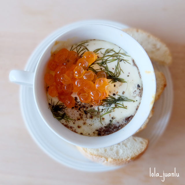Pasado ese tiempo, sacamos la bandeja del horno y emplatamos cada taza sobre un plato y decoramos con una cucharada de huevas de lumpo rojo. Yo las que utilicé fueron de salmón.