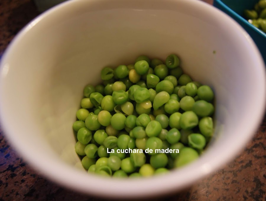 Hacemos los guisantes en un caldero con agua según nos ponga el fabricante; si los tienes de lata también te valen pero así son más sabrosos. Reservamos.Vamos precalentando el horno a 180 grados.