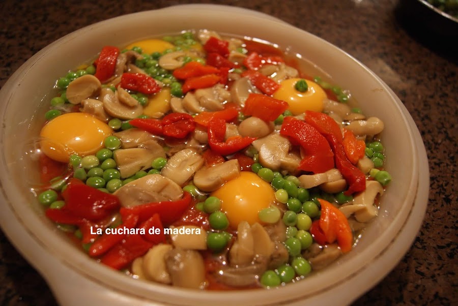 Comenzamos poniendo encima, pero sin tapar la yema los champiñones laminados, los guisantes y el pimiento rojo en tiras; con una cuchara mezclamos bien la clara y tomate para que se mezclen sin romper las yemas