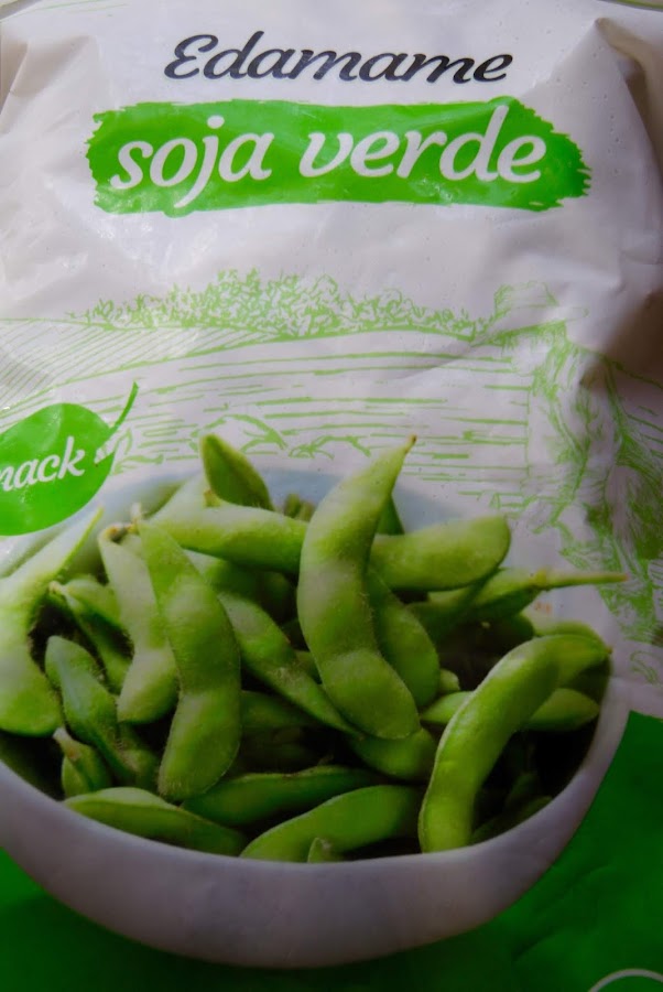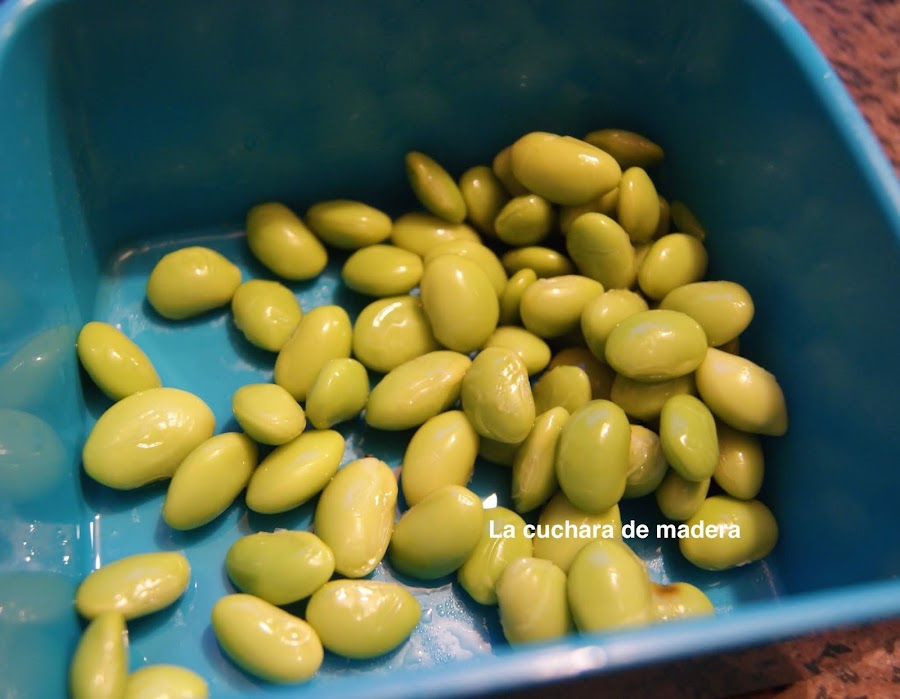 Enjuagamos el caldero de los guisantes y hacemos las 30 unidades de edamame en agua. Lo venden en la parte de congelados