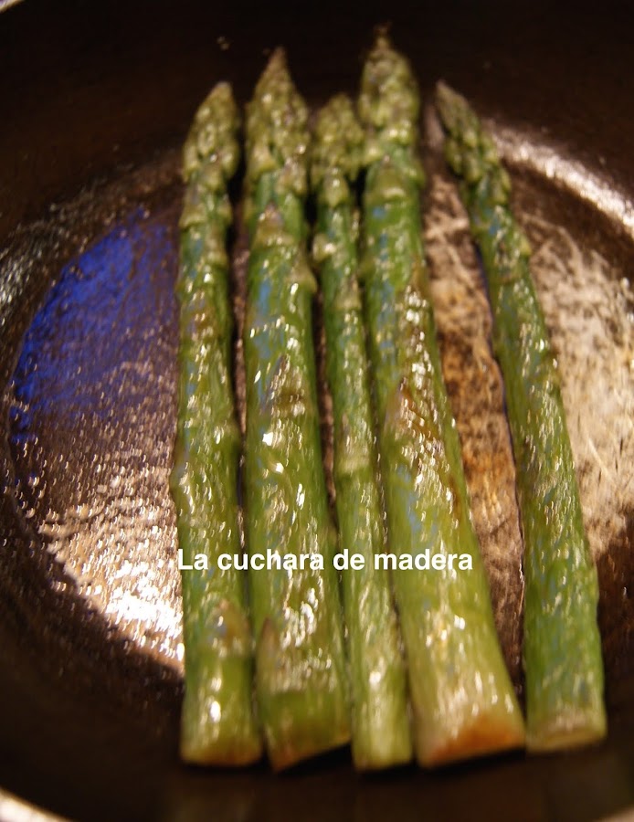Elaboración:En una sartén pones un hilo de aceite, fuego medio y colocamos los espárragos. Se hacen muy rápidos, les das un par de vueltas y retiramos.Reservamos