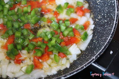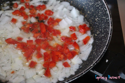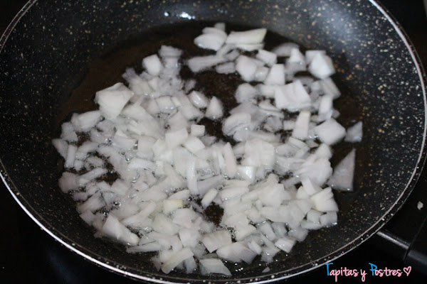 Ponemos el aceite en una sartén y sofreímos la cebolla cortada a cuadraditos.