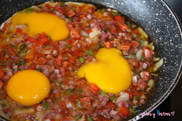 Para acabar cascamos tres huevos en la sartén y tapamos para que se cocinen hasta que la clara esté cuajada y la yema a nuestro gusto.